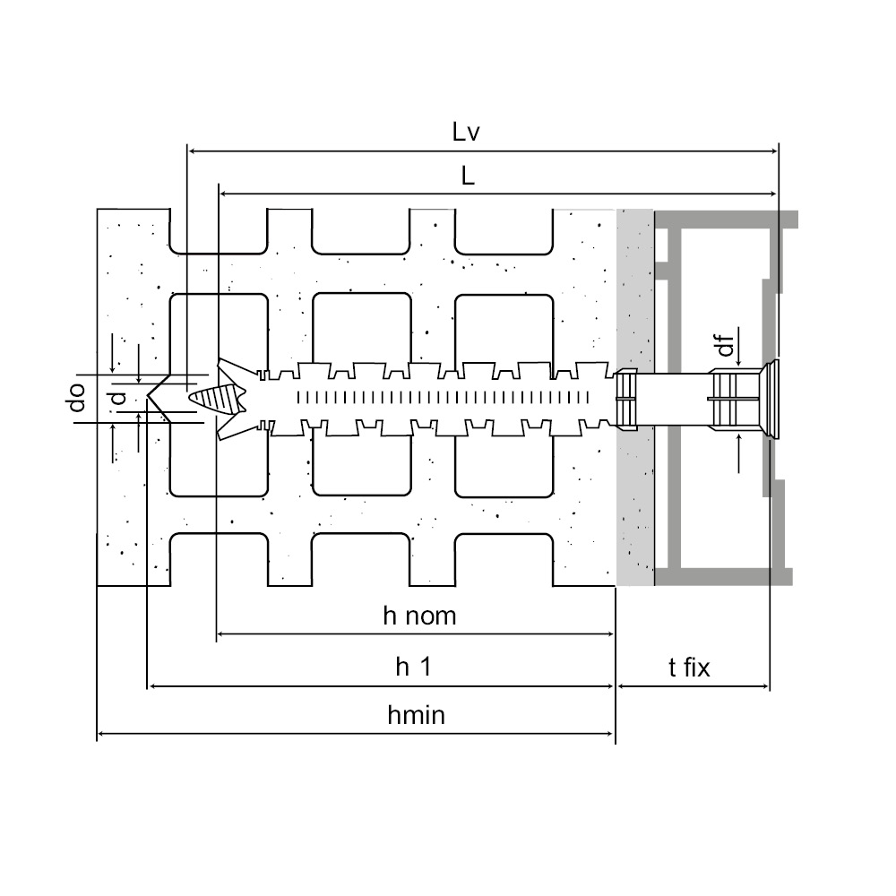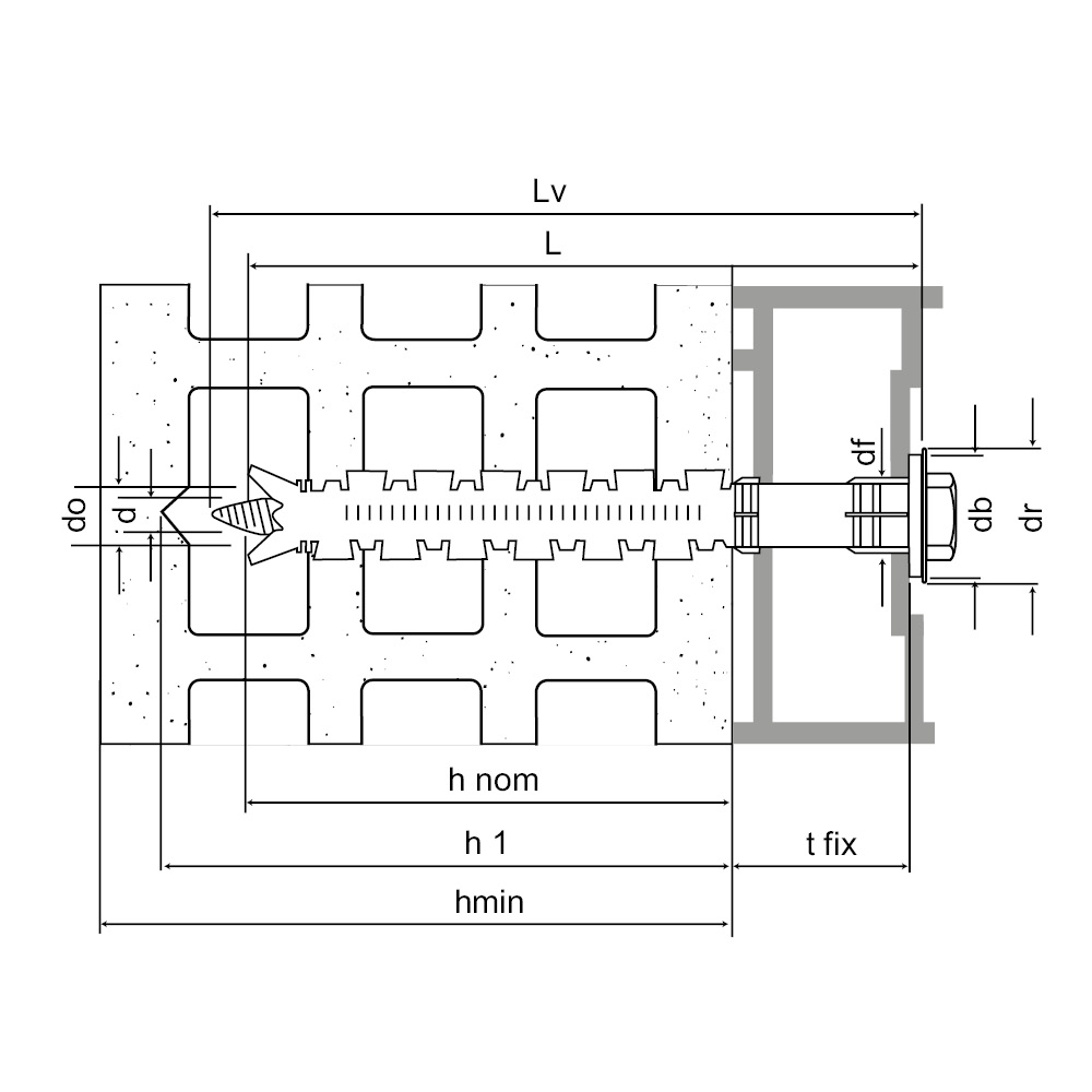 | Ø drilling hole [d0] [mm] | Min. drill depth [h1] [mm] | Ø drilling fixture [df] [mm] | Wrench size [SW] [mm] | |||