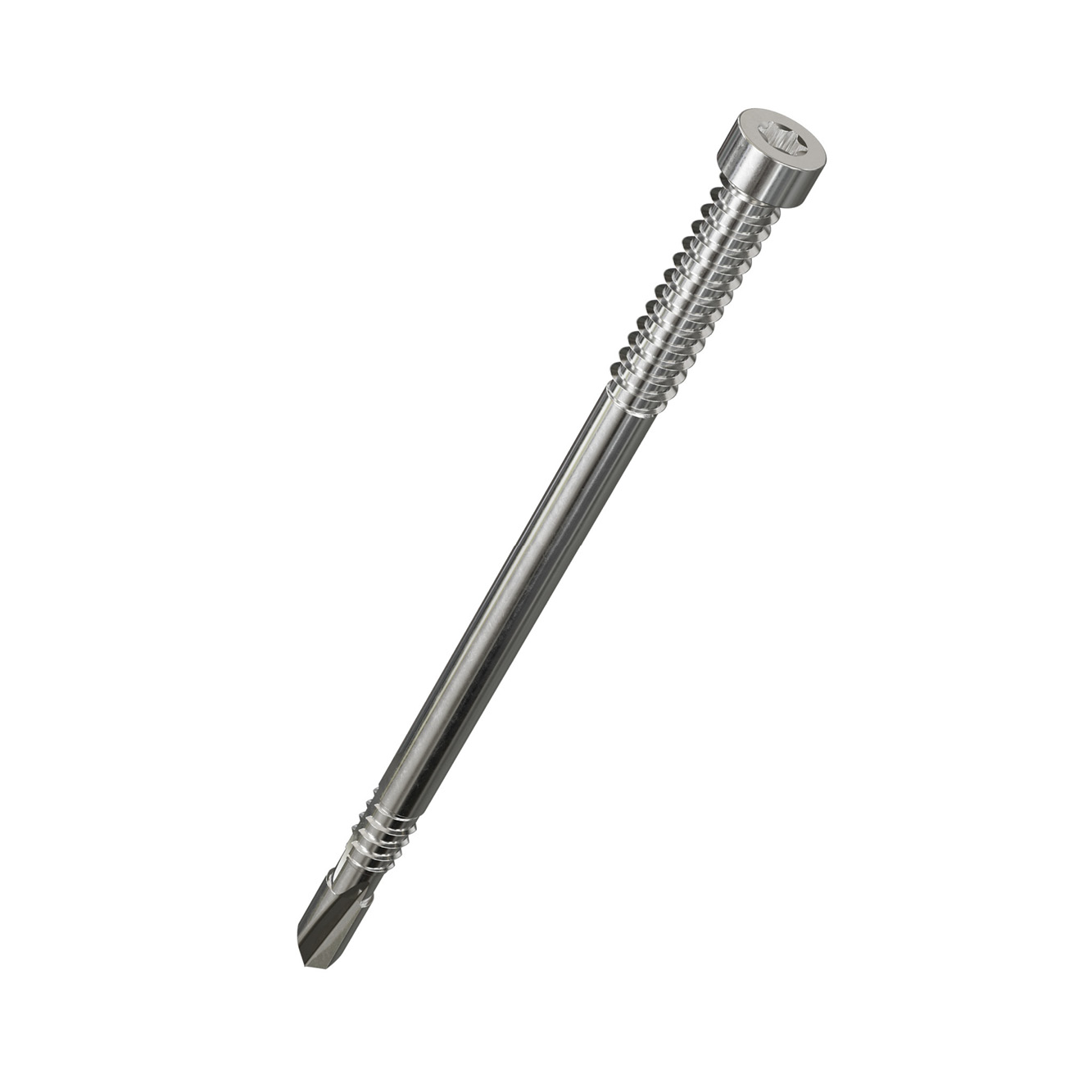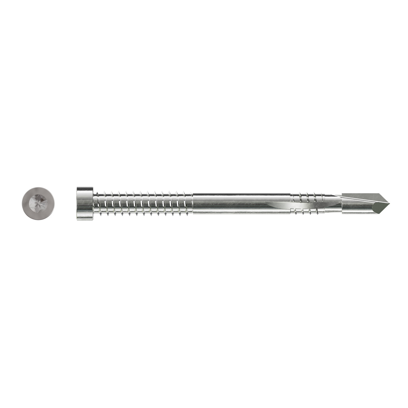 El pasador de doble rosca tiene una cabeza cilíndrica con un accionamiento T-40 de 6 lóbulos y el exclusivo diseño de la punta reduce la formación de grietas en la madera. La ranura de la rosca inferior permite retirar material durante la instalación.