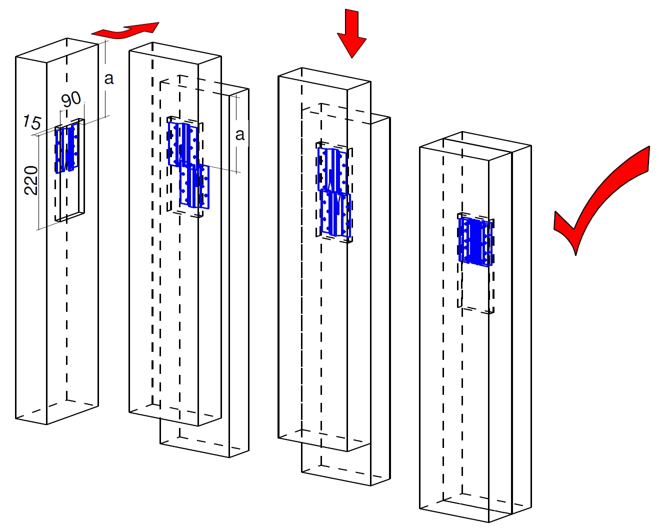 - La instalación del ICST requiere la realización de un refrentado en un solo montante. Este refrentado debe tener una profundidad de 15 mm, una anchura de 90 mm y una longitud mínima de 220 mm. La distancia mínima del ICST respecto a los extremos de los montantes es de 100 mm,
