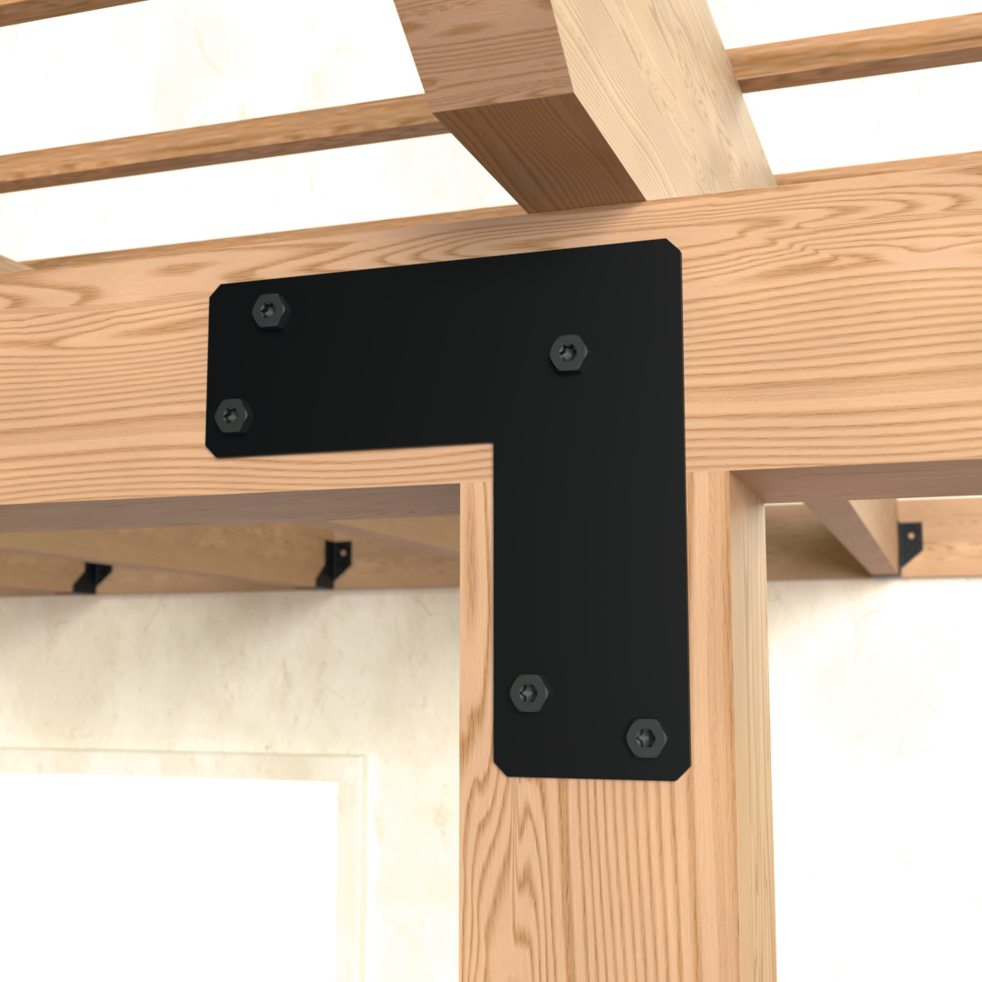Escuadra plana en forma de L para conexiones poste-viga en construcciones de jardín ligeras como pérgolas.