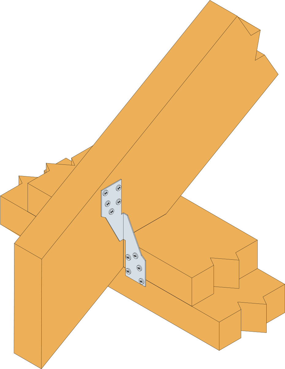 Estas escuadras, diseñadas para fijar cerchas y cabrios sometidos a la acción de vientos extremos, pueden utilizarse en numerosas configuraciones en las que se entrecrucen dos elementos de madera.