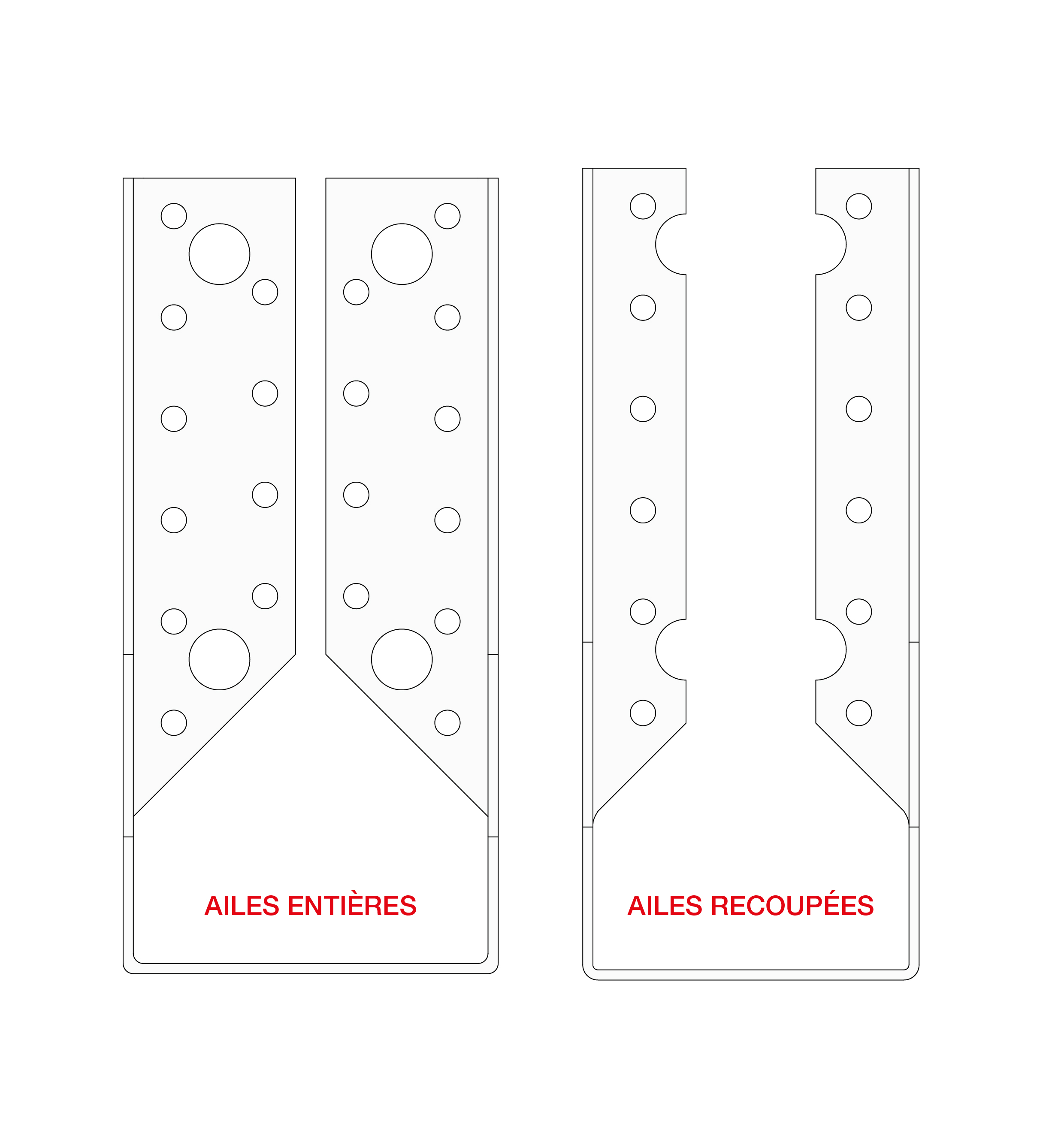 | Modelo | Desarrollo [mm] | Sólo con agujeros para la punta (alas recortadas) | Con agujeros para los tirafondos y las puntas (alas enteras) |