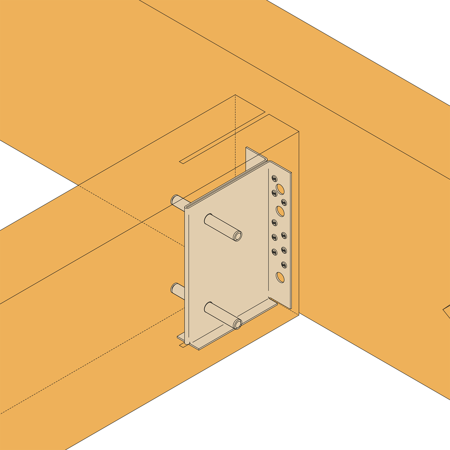 Los estribos con alma interior permiten conseguir uniones discretas. El talón inferior sirve para posicionar el estribo con respecto al elemento de madera, lo que facilita el montaje de las clavijas.