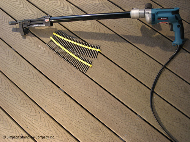 Herramienta en Teflón® para fijación sobre soporte de madera y entarimado. Ideal para fijar las terrazas exóticas (tarima y soporte en madera exótica) SIN pre-taladrar. Acepta tornillos en cinta Quik Drive® de 38 hasta 76 mm de longitud. Garantía de 3 años (sujeto a condiciones).