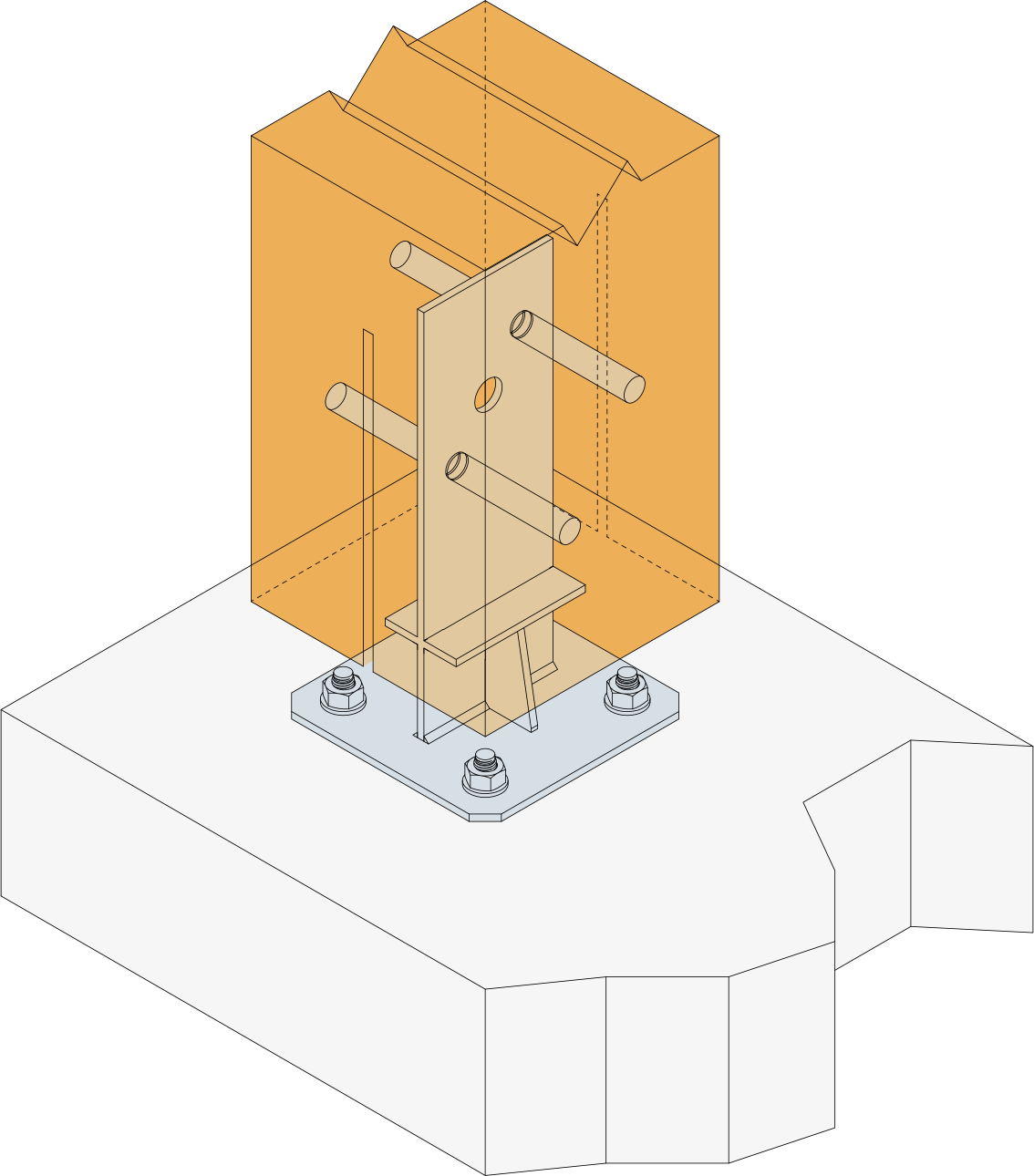 ** Consulte la gama de anclajes Simpson Strong-Tie para seleccionar los anclajes adecuados. Las soluciones estándares de anclajes dependen del tipo de hormigón, las distancias entre dos anclajes y las distancias a los bordes.