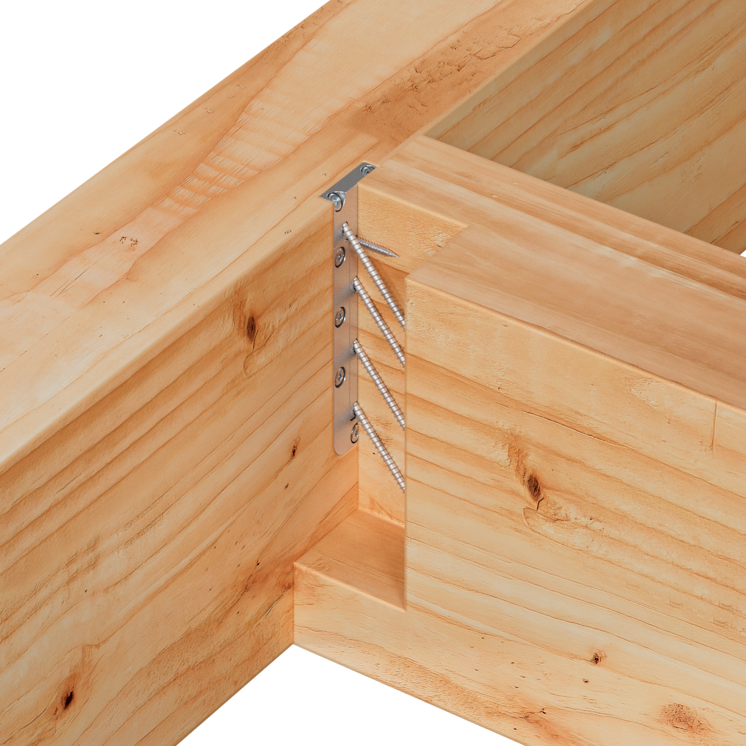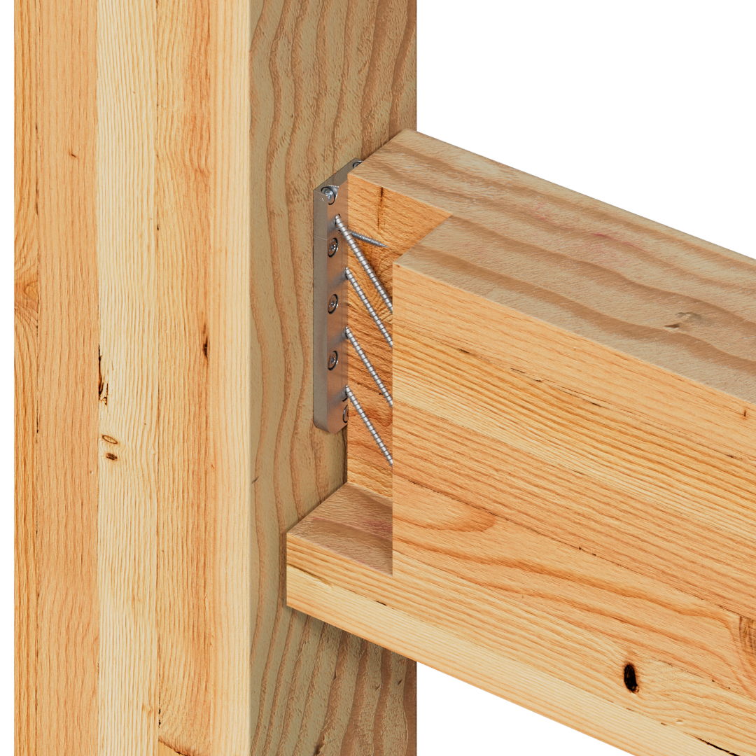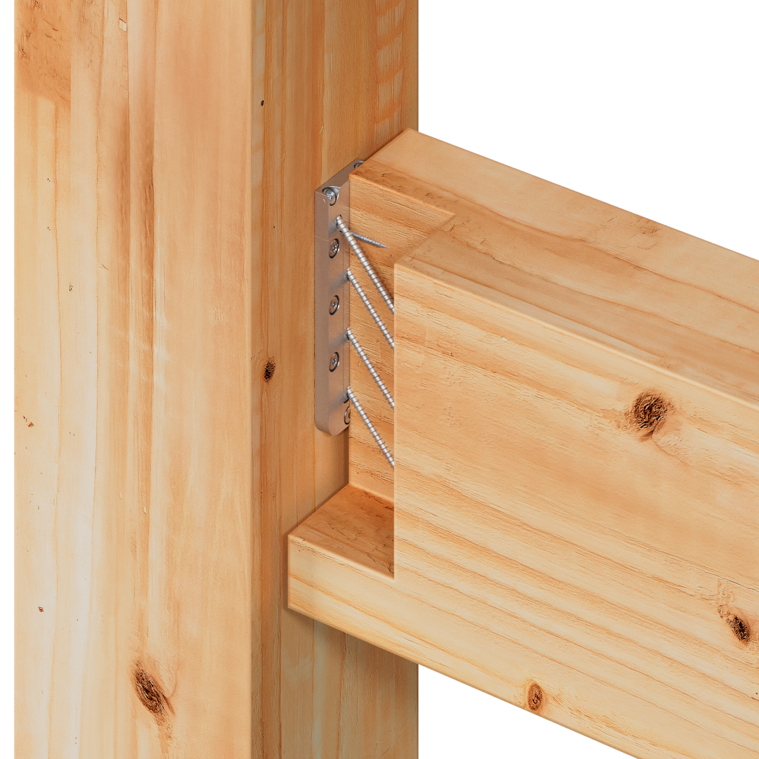 Para evitar la rotación y absorber las cargas ascendentes, laterales y axiales, se insertan dos tornillos opcionales totalmente roscados desde la vigueta a través del conector hasta el soporte.
