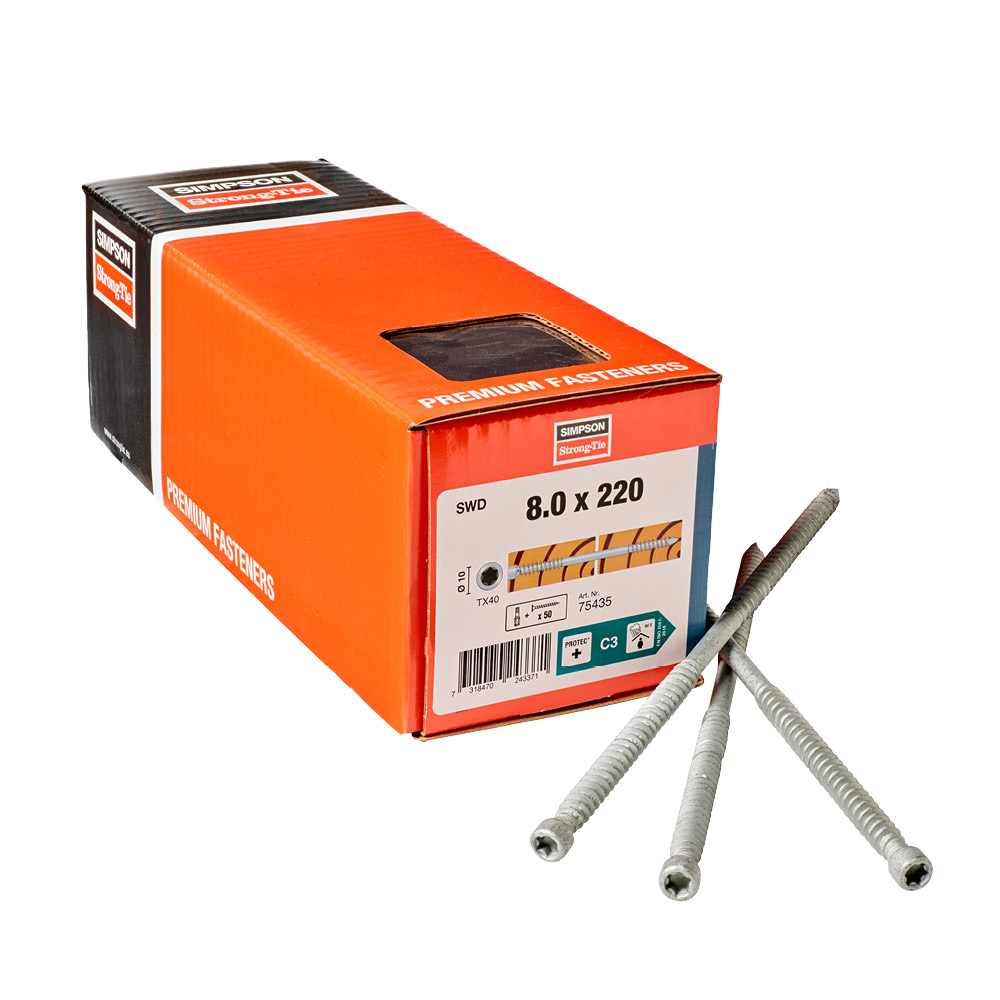SWD es un tornillo de construcción diseñado para conectar dos cuerpos de madera entre sí. La pequeña cabeza en forma de tapa y la doble rosca crean un conjunto flexible e invisible de alta resistencia. El paso de rosca diferenciado genera un efecto de abrazadera, reduciendo el riesgo de que queden huecos entre las piezas de madera.